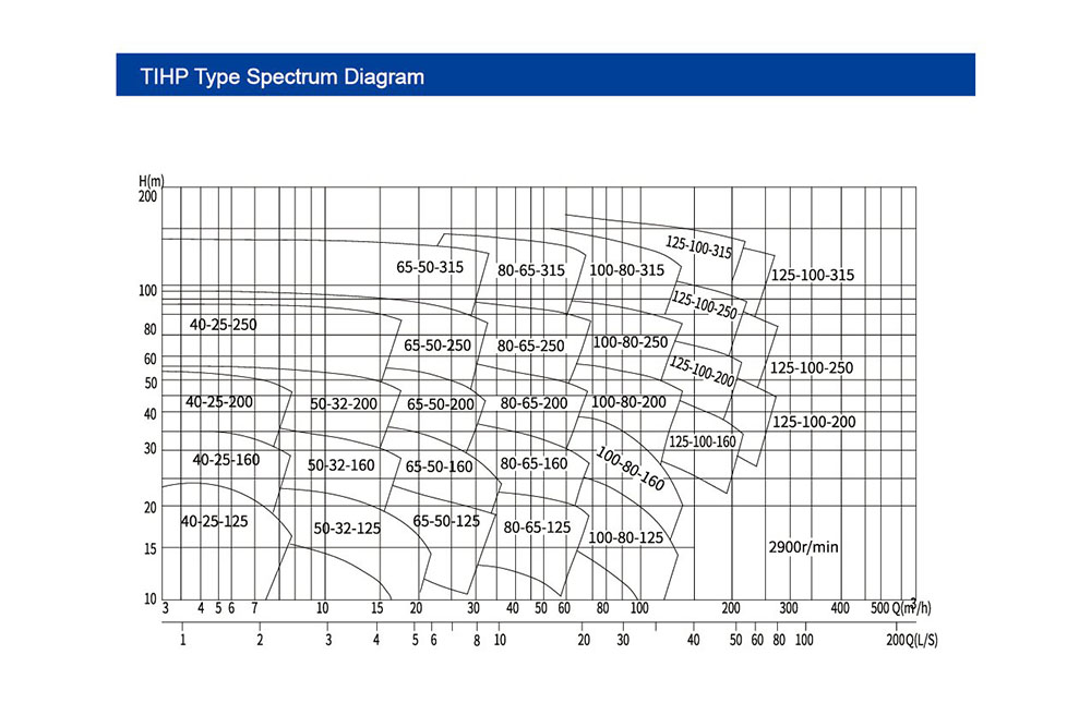 Diagramak kurba eta zona anitz biltzen ditu, bakoitza ponpa eredu zehatz bat ordezkatzen duena. Adibidez, "40-25-125" eta "50-32-160" ponpa eredu ezberdinak adierazten dituzte.